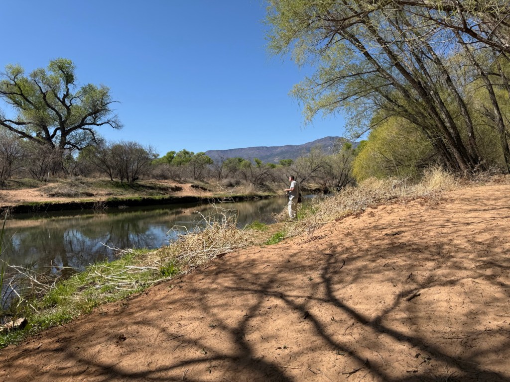 this shore where a fly fisherman stands and waits